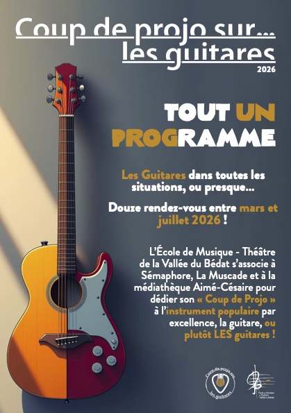 L’École de Musique – Théâtre de la Vallée du Bédat s’associe à Sémaphore, La Muscade et à la médiathèque Aimé-Césaire pour dédier son « Coup de Projo » à l’instrument populaire par excellence, la guitare, ou plutôt LES guitares !